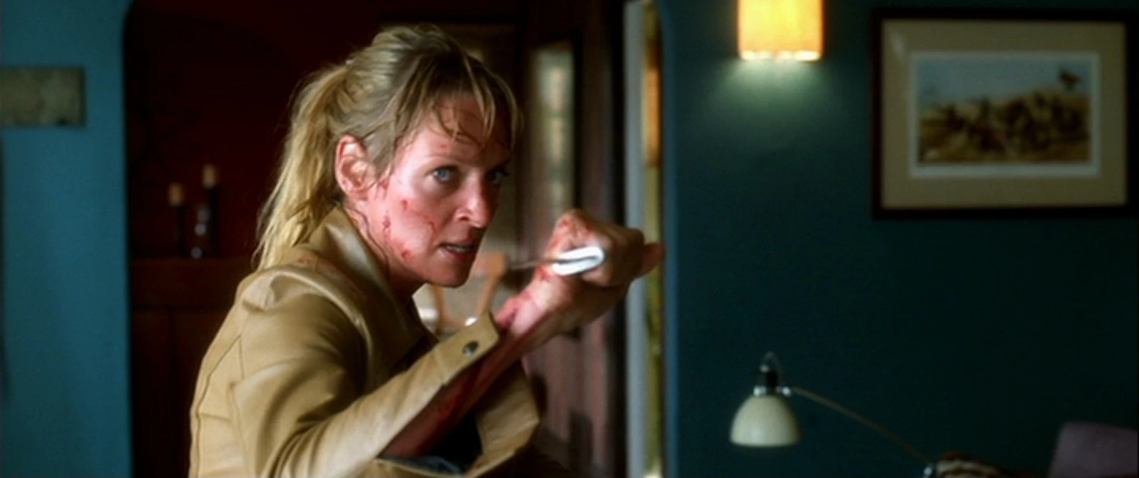- Edge weapon proficiency: Beatrix is also well-versed in using single-edge weapons, displaying her skill to Pai Mei on their initial meeting using a Jian. It is implied that Beatrix learns more from Pai Mei, demonstrating Pai Mei-like skill when Bill attacks her with a sword during their conversation at a table. Beatrix defends against the attack with the sword's scabbard and manages to "catch" the sword in its scabbard, thus disarming Bill. She was able to kill O-Ren with her Hattori Hanzo katana, despite O-Ren being slightly more skilled (O-Ren even noted that Beatrix is not as skilled as she thinks she is). Aside from her excellent samurai sword skill in both single and melee combat, she is also proficient in the use of two swords, as shown when cornered by the Crazy 88. In the very same confrontation, she combined this skill with Capoeira-like moves to incapacitate a large number of foes. Furthermore, she has demonstrated decent prowess in knife throwing and handling.