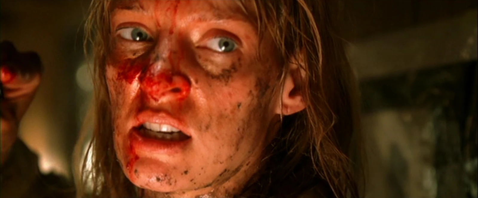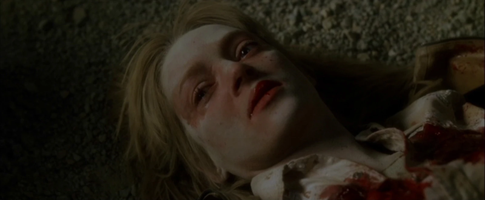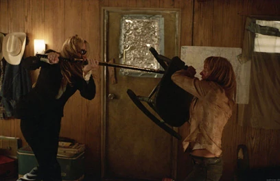 The two armed women charge at one other with swords drawn. In a clutch, with swords crossed, Beatrix snatches out Elle's other eye, leaving her blindly shouting and crawling on the floor. Although Elle was not killed, she was left in the trailer with Elle's Black Mamba that killed Budd.